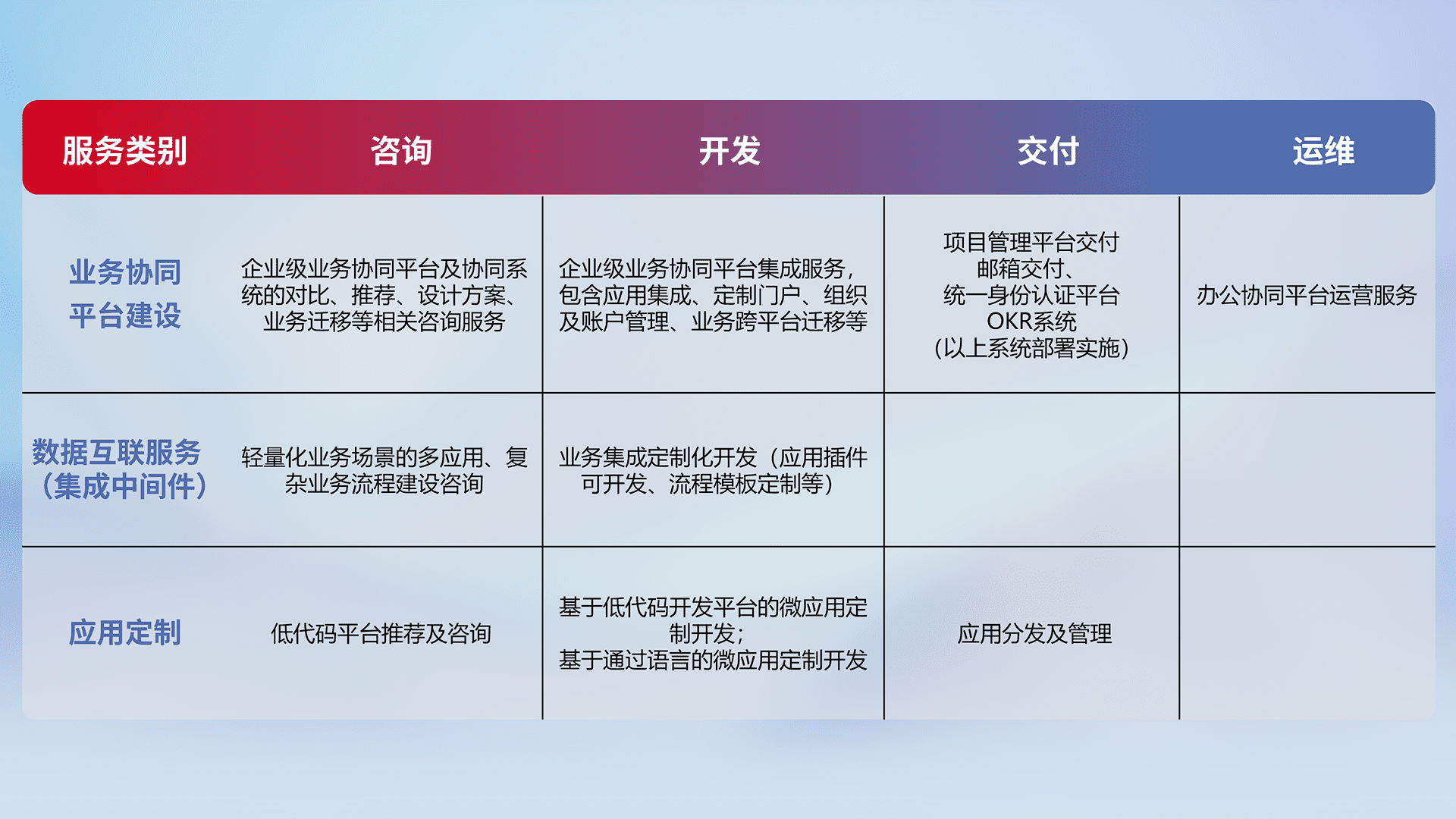 针对钉钉、、企微、、、、IDaas等平台级产品提供产品的规划、、、、方案、、交付、、定制化开发等服务,,实现如统一协同办公、、、智能客户服务、、、、混合会议管理、、、智能数据查询、、等业务场景,,,,实现数字化转型。。