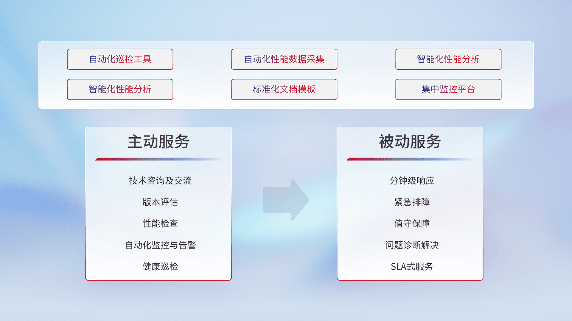 智能化工具和标准化文档,,,,保障服务质量,,,,提供主动服务(包含技术咨询、、、、版本评估、、、、性能检查、、自动化监控与告警、、、、健康巡检)和被动服务包含(分钟级响应、、、紧急排障、、、值守保障、、问题诊断解决、、、、SLA服务)。。