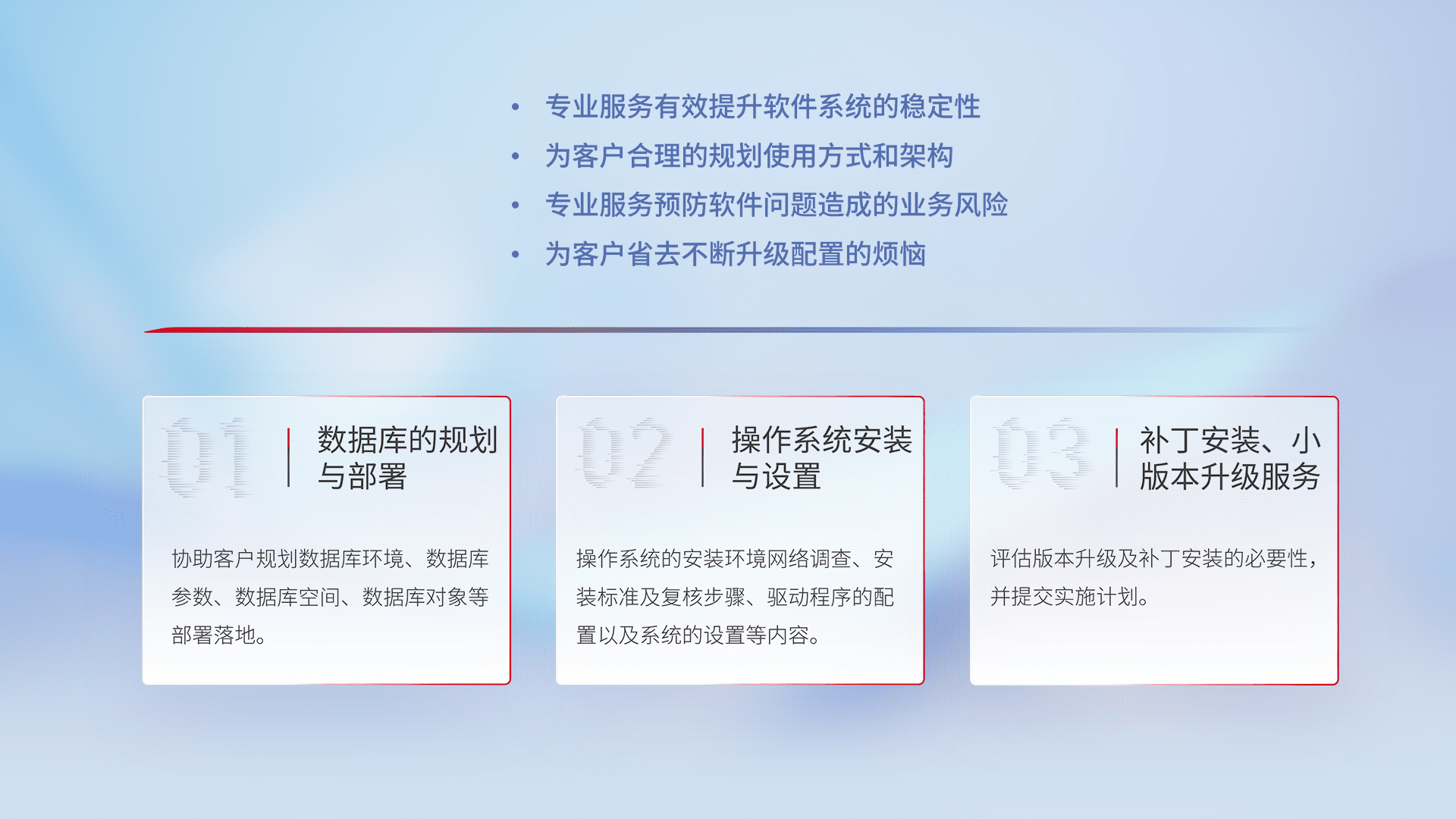 为客户提供软件规模升级、、、、快速部署、、、按需配置的专业服务,,,,从数据库的规划与部署到操作系统的安装与设置,,,,再到补丁安装和小版本升级提供支持。。。